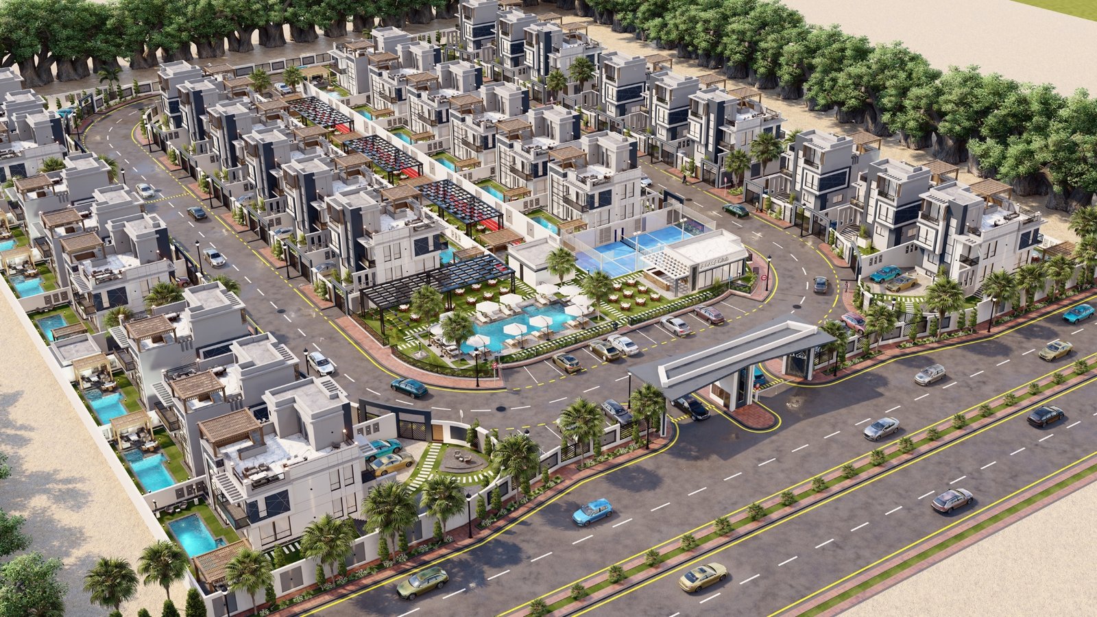 - مساحات خضراء وبحيرات وبول خاص لكل فيلا.