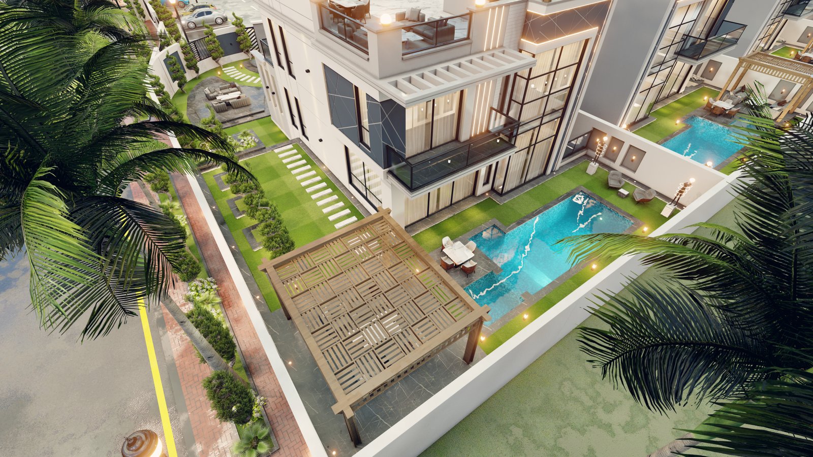 - واجهة مودرن بفتحات زجاجية واسعة.
